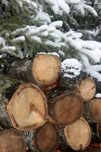pins et bûches enneigés